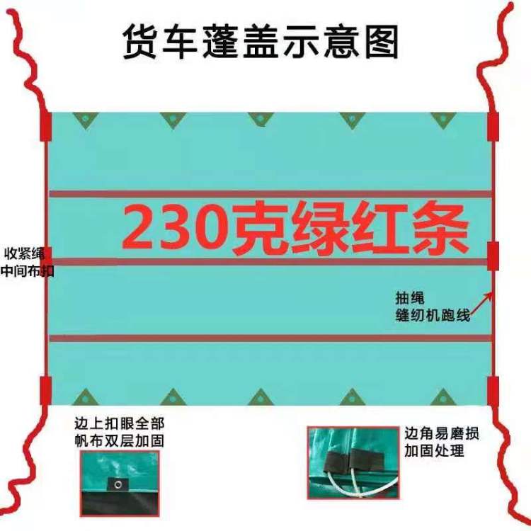 產(chǎn)品介紹綠紅條色PE防水篷布汽車(chē)篷布,貨車(chē)篷蓋示意圖如上。綠紅條色PE防水篷布高溫?zé)崛燮唇?,無(wú)縫拼接不漏水;雙面PE覆膜,雙面防水;金···